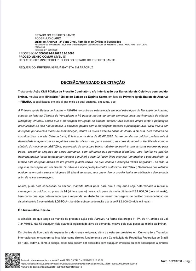 A Justiça acatou pedido do Ministério Público do Estado do Espírito Santo (MPES), em ação da Promotoria de Justiça de Aracruz, e deu prazo de 24 horas para a retirada de um outdoor, patrocinado pela Primeira Igreja Batista em Aracruz (Pibara), no Espírito Santo.