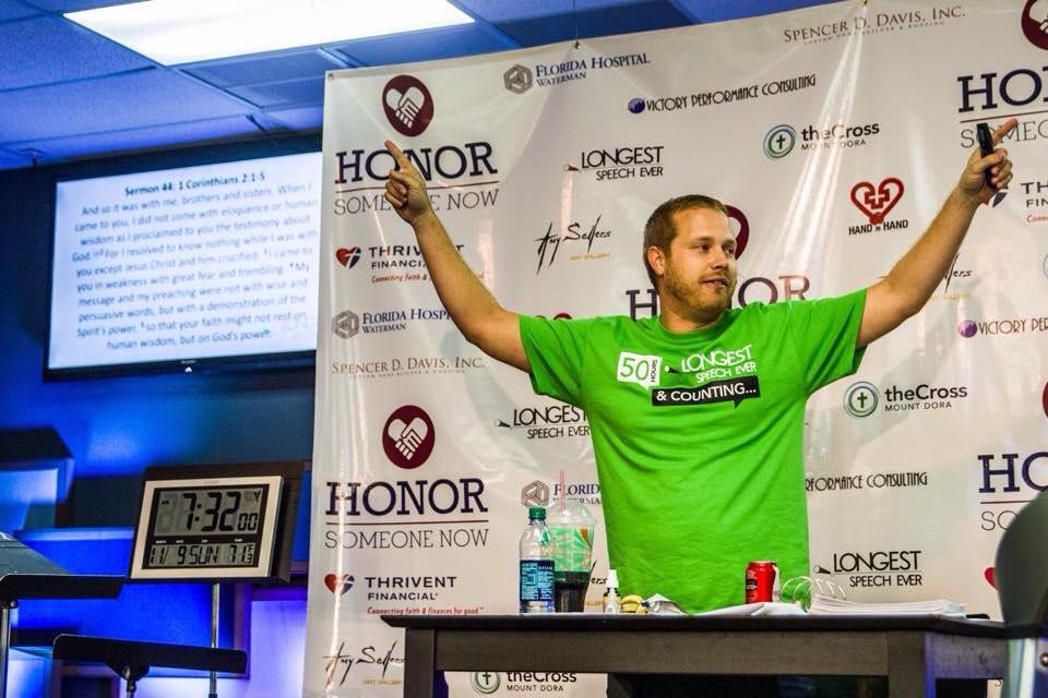 Zach Zehnder, pastor da igreja “The Cross” em Mount Dora, queria superar o recorde anterior do Guinness, cifrado em 48 horas e 31 minutos e realizado por Vickrant Mahajan na Índia.