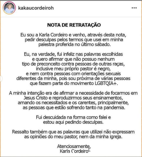 “Eu, na verdade, fui infeliz nas palavras escolhidas e quero afirmar que não possuo nenhum tipo de preconceito contra pessoas de outras raças, inclusive meu próprio pastor é negro, e nem contra pessoas com orientações sexuais diferentes da minha, pois sou próxima de várias pessoas que fazem parte do movimento LGBTQIA+”, disse.